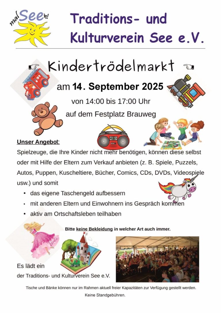 Der Ortschaftsrat lädt am 21. Juni 2025 zum Kinderfest am Spielplatz an der Kirche und zum 3. Musik-Kinosommerabend auf dem Sportplatz ein. Am Nachmittag gibt es Spiel, Musik und eine Traktorfahrt für Kinder, am Abend Live-Musik und einen Musikfilm unter freiem Himmel. Für das leibliche Wohl sorgen die Bäckerei Bieneck und der Ortschaftsrat.
